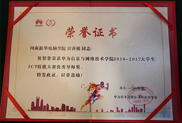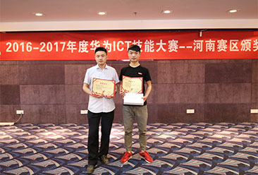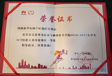 5月9日,由华为网院联手高等院校共同举办的“华为2016-2017大学生ICT技能大赛”河南赛区颁奖典礼在郑州隆重举行,河南新 华电脑学院智能网络与安全工程师专业的陈任可同学喜获冠军。