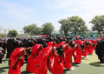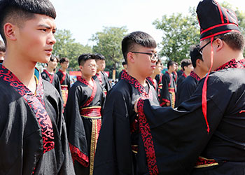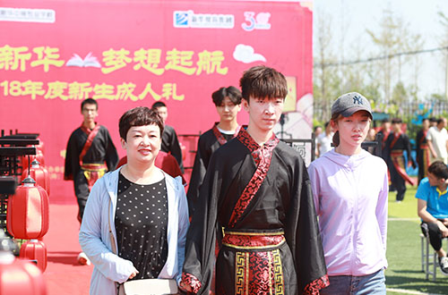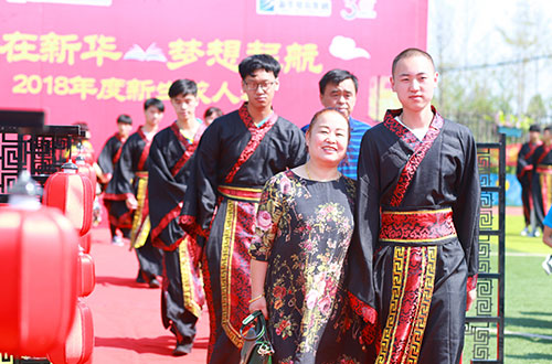 新华新生着汉服,依照传统习俗举行及笄礼和加冠礼,叩拜师长和父母,庄严盟誓。在赞礼官的唱礼声中,男子加冠,女子加笄,并逐一完成“敬先贤、拜先师”,“法圣贤、正衣冠”,“感恩父母、修身立世”,“聆训”,“宣誓”等仪式,从而宣告自己步入成年之列,走向一个崭新的世界。在庄严的仪式后他们也即将由家庭中毫无